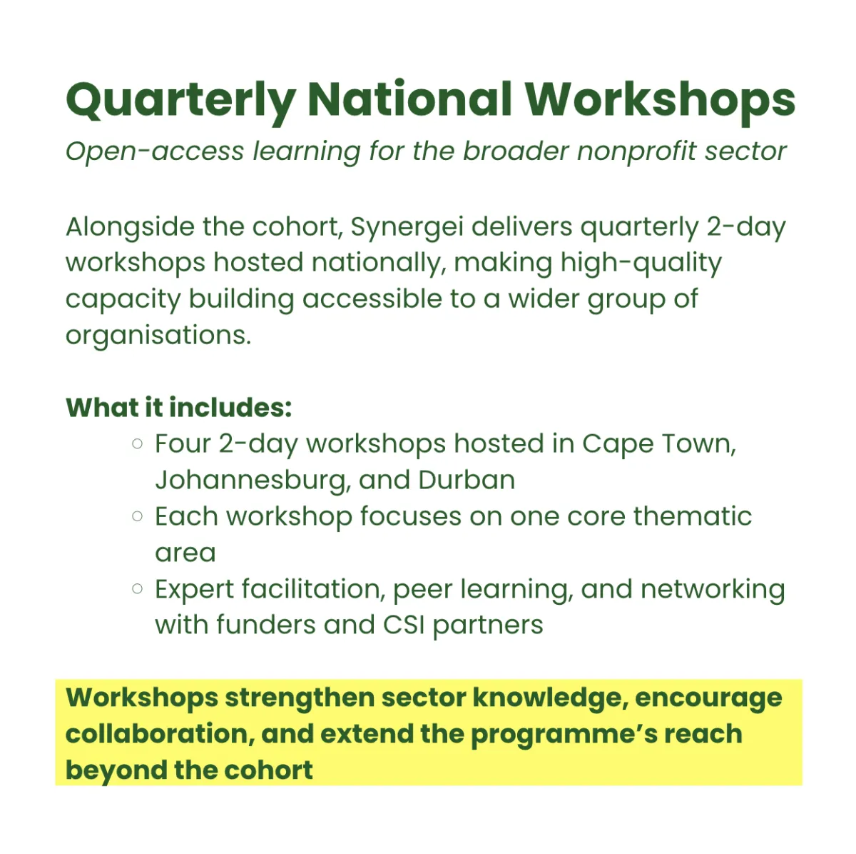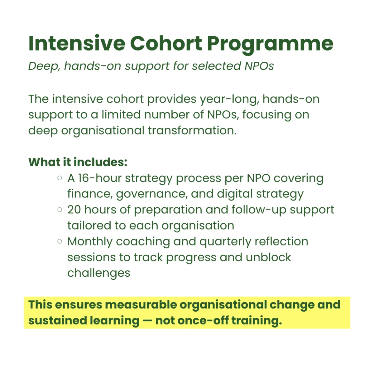 A 12-month intensive cohort and workshop programme to build financially sustainable, digitally capable, and well-governed nonprofits across South Africa.